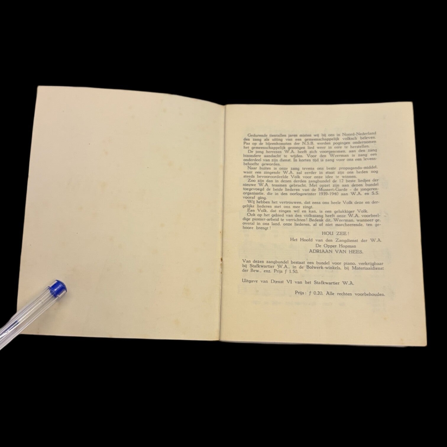Zeer mooi en zeldzaam zangboekje van de W.A. (weerafdeling van de NSB). Het boekje is compleet en in super staat. Dit boekje is zeldzaam en het zal lastig zijn een andere en/of mooiere dan deze te vinden.